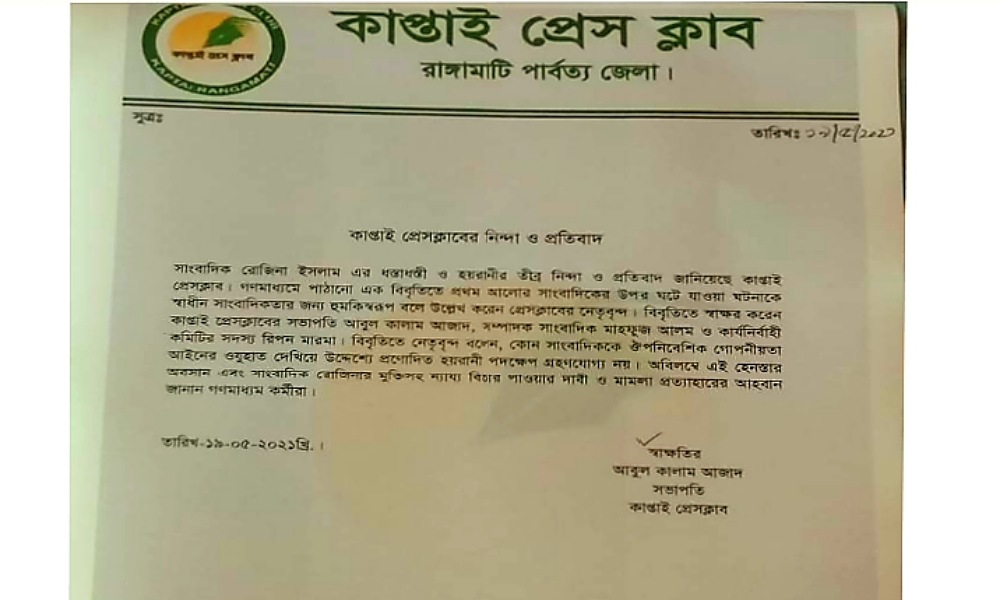কাপ্তাই প্রেসক্লাবের নিন্দা ও প্রতিবাদ